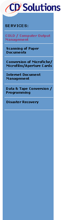 COLD / Computer Output Management Services Outsourcing COLD / COM to us is a cost-effective and efficient method of transferring computer generated reports or other files to CD, optical disc, the Internet, hard disk, removable disk or a server.