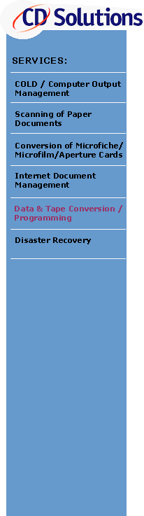 CD Solutions specializes in data & tape conversions and customized programming for Computer Output Management and the Electronic Records Management (ERM) field.